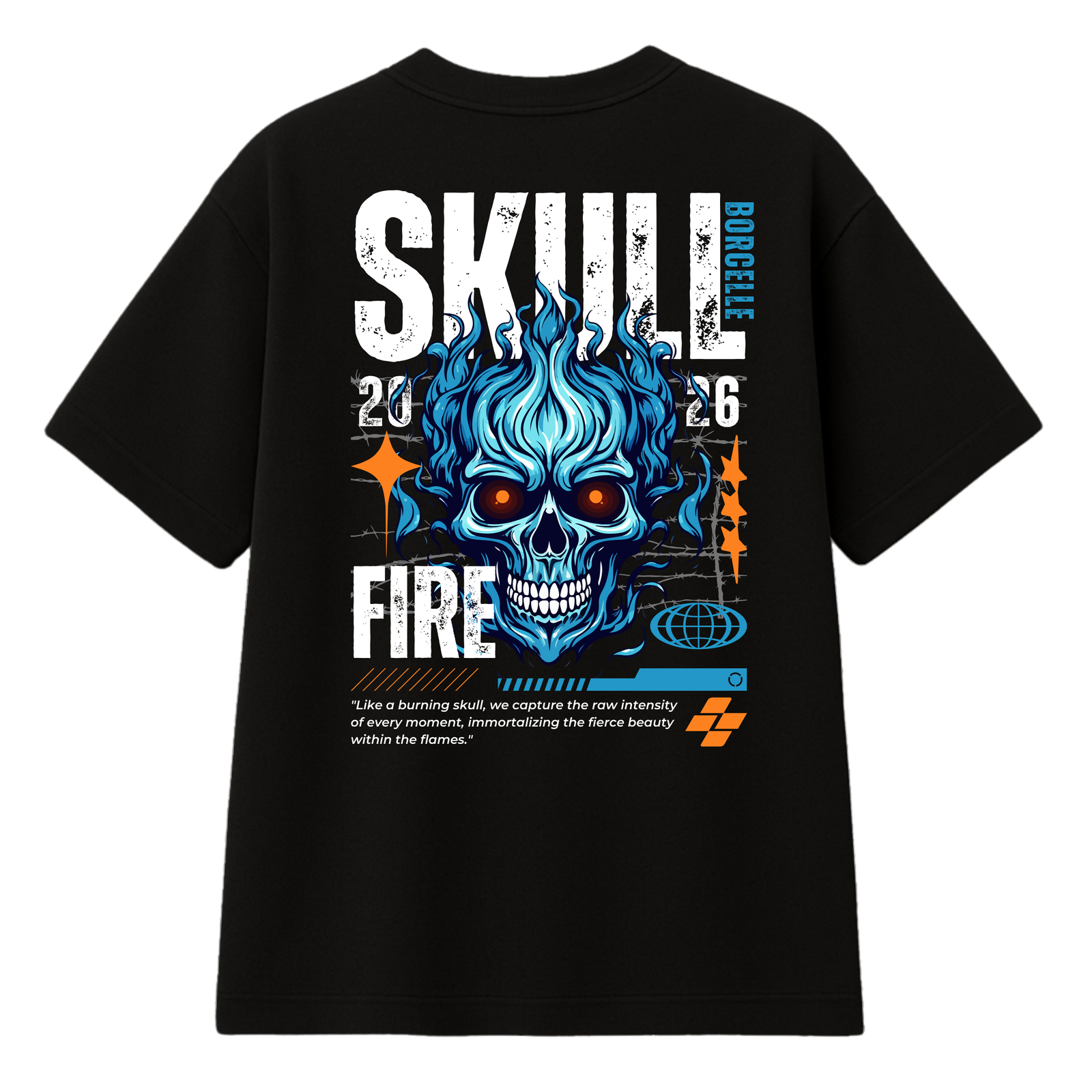 Le T-shirt Streetwear Skull “Skull Fire” est une pièce maîtresse conçue pour ceux qui n’ont pas peur d’afficher une identité visuelle forte et provocante. Le design central présente un crâne détaillé enveloppé de flammes bleues spectrales, créant un contraste saisissant avec les accents orange vif et la typographie massive “SKULL FIRE”. Ce visuel est complété par la mention “BORCELLE 2024” et une citation puissante : “Like a burning skull, we capture the raw intensity of every moment, immortalizing the fierce beauty within the flames”, soulignant la passion dévorante de la culture de rue.